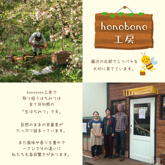 新潟のお米と、藤沢の北部でミツバチを大切に育てている「honobono工房」が自家採蜜した天然はちみつを使用。