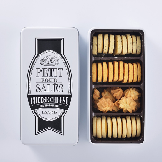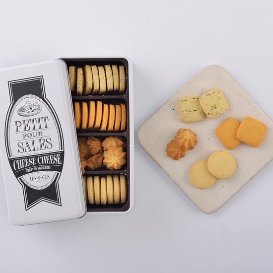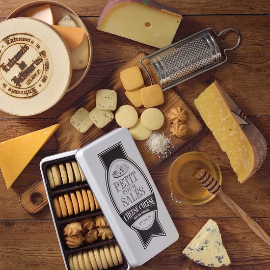 ワインの名脇役・チーズを、焼き菓子に仕立てました。レッドチェダー、ゴーダ、ゴルゴンゾーラ(パセリで青カビを表現)といった個性豊かなチーズの風味が際立つクッキーに、はちみつクッキーを添えて。チーズにはちみつをかけて味わうように、甘じょっぱいマリアージュをお楽しみいただけます。クラシカルなチーズラベル風デザイン缶に詰めて、ちょっとダンディーに。ワイン好きなあの人への贈りものにもおすすめです。